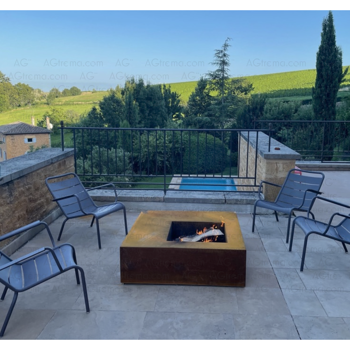 Brasero Compŏsĭtus en acier Corten en 100cm, posé sur une terrasse dans le sud, ambiance farniente